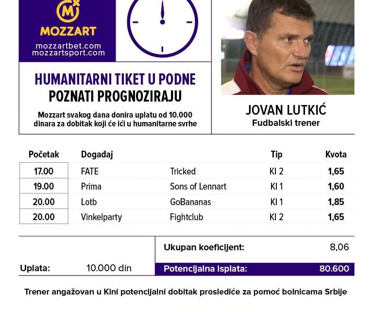 On je na danas na MOZZART kvoti 8,06! Verujemo Jovanu od koga očekujemo dodatni plus na našu do sada doniranu sumu u iznosu od 14.876.989 dinara. A, ako se pitate kako se snašao, odmah ćemo vam reći da su se mlađi članovi MOZZART Sport redakcije složili s njegovim izborom E-Sports tipovanja. Dakle, ima sve ovo dosta izgleda za prolazak