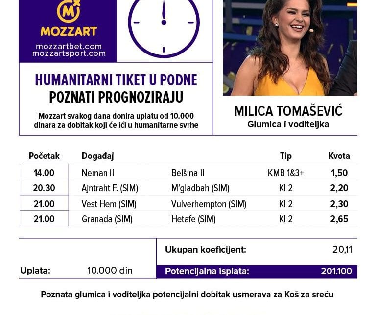 Četiri para, a tri MOZZART dvojke… Tako to radi šarmantna glumica i voditeljka Milica Tomašević koja se ne libi simulacija mečeva elitnih svetskih liga u poteri za kvotom 20,11, koja joj na listić donosi potencijalni dobitak od 201.100 dinara koje namenjuje za „Koš za sreću“.
