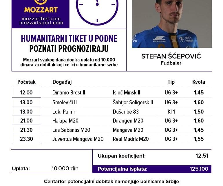Odabrao je čak šest udarnih parova dana, pa došao do kvote 12,51. Zaista uzoran koeficijet koji nosi potencijalni dobitak u iznosu od 125.100 dinara. Dostojan bi to plus za našu cifru ukupnih donacija u „Himanitarnom tiketu u podne“ koja iznosi 14.876.989 dinara.