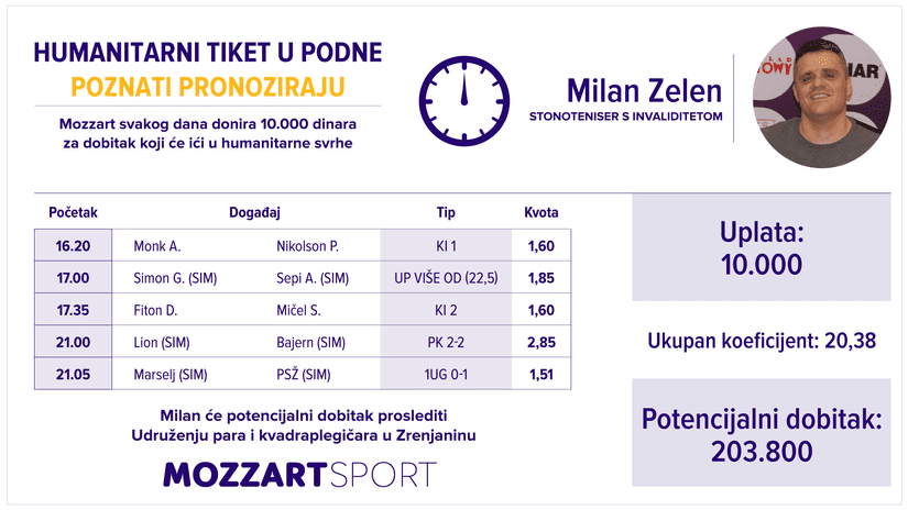 Humanitarni tiket u podne kompanije MOZZART ima još jednog dobitnika u vreme nestašice najkvalitenijih takmičenja zbog epidemije virusa korona. Nakon, Slavka Perovića, Bore Đorđevića, Zorana Njeguša i Milan Zelen sastavio je dobitni tiket. Osvajač ekipne bronzane medalje sa Evropskog prvenstva iz Laškog usmerio je fantastičan dobitak od 203.800dinara za Udruženje para i kvadriplegičara Zrenjanin. Prošle su tri simulacije, PK 2-2, 1UG 0-1 i UP više od 22.5, uz to i dva pikado okršaja.
