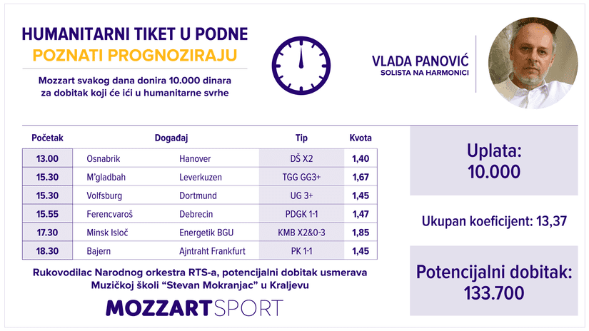 U globalu, značajna suma, zar ne? E, pa jeste, baš kao i podvig svakodnevnog tipovanja u kome novinari Mozzart Sport portala svakog dana, već skoro četiri godine tačno u podne s poznatima kreiraju kladilački interesantne tikete. Pustimo sada Vladu Panovića da se dokaže kvotom 13,37, odnosno potencijalnim dobitkom u iznosu od 133.700 dinara koji namenjuje Muzičkoj školi “Stevan Mokranjac” iz rodnog Kraljeva.